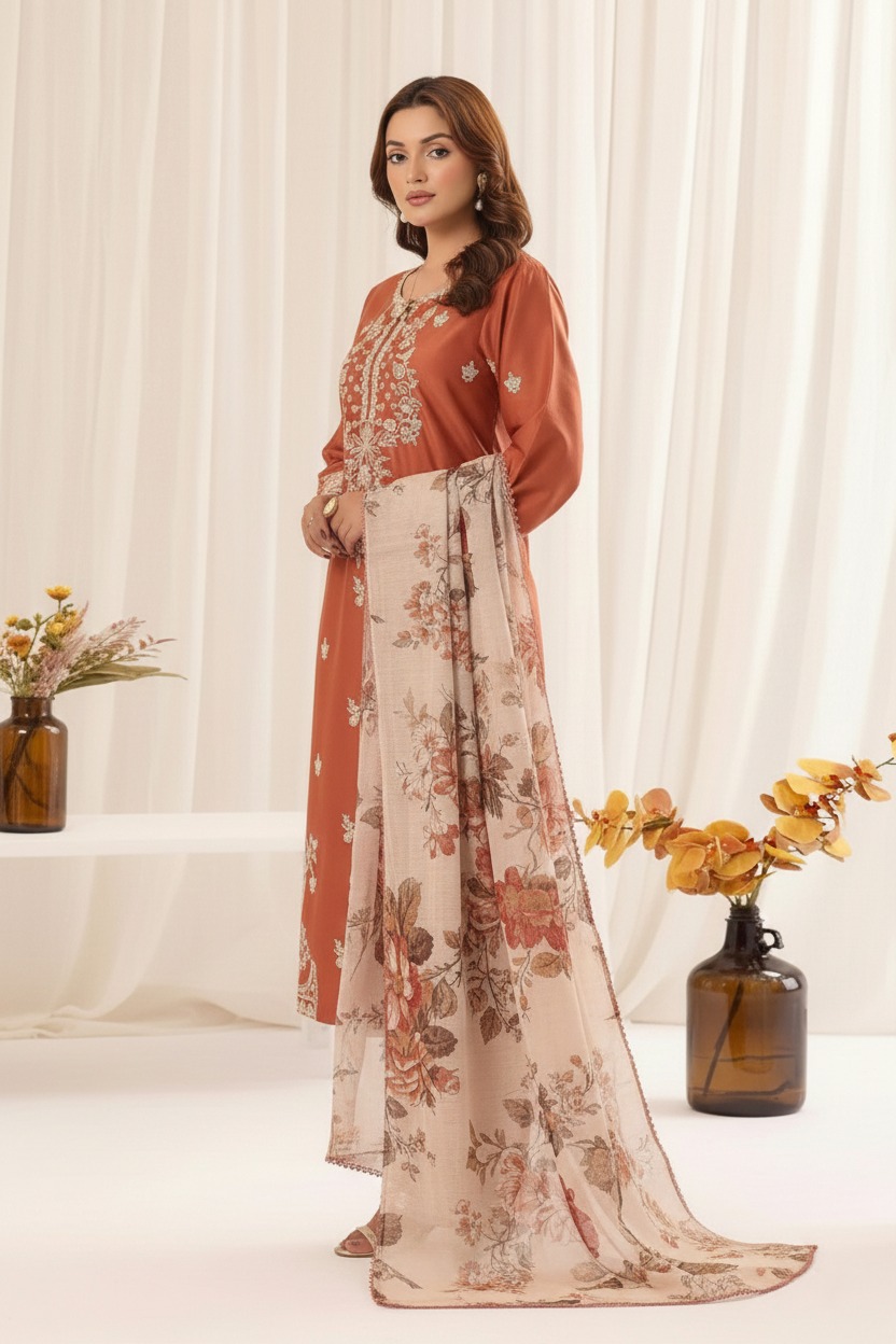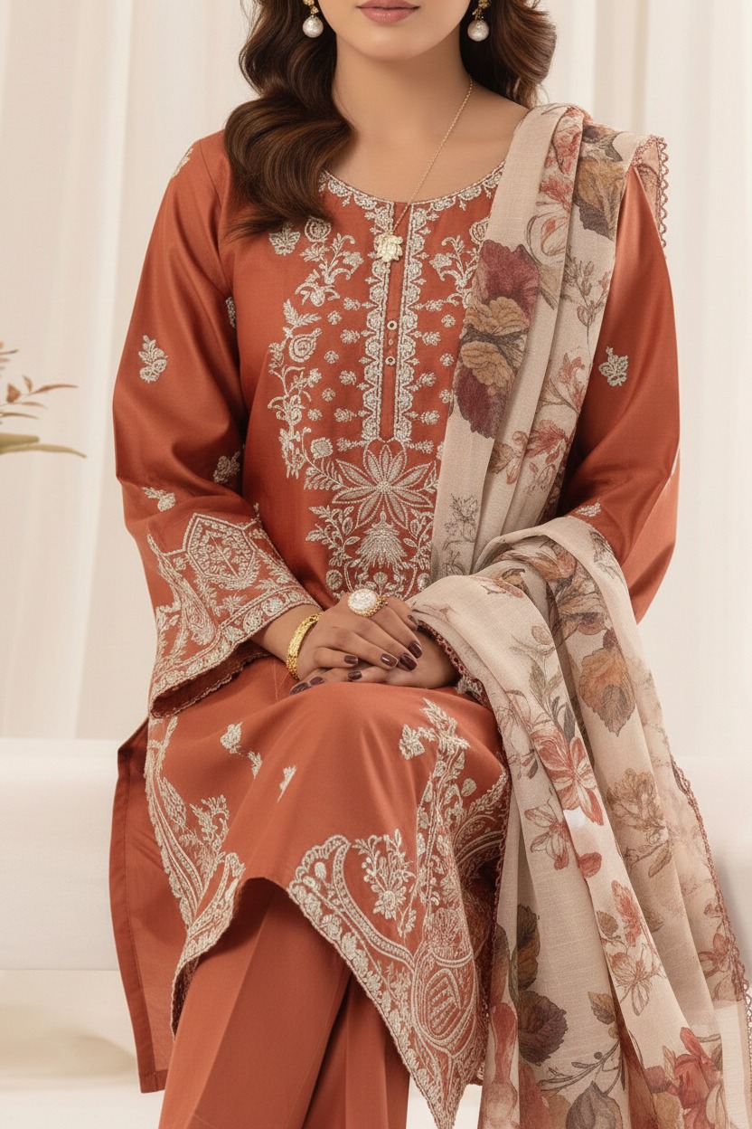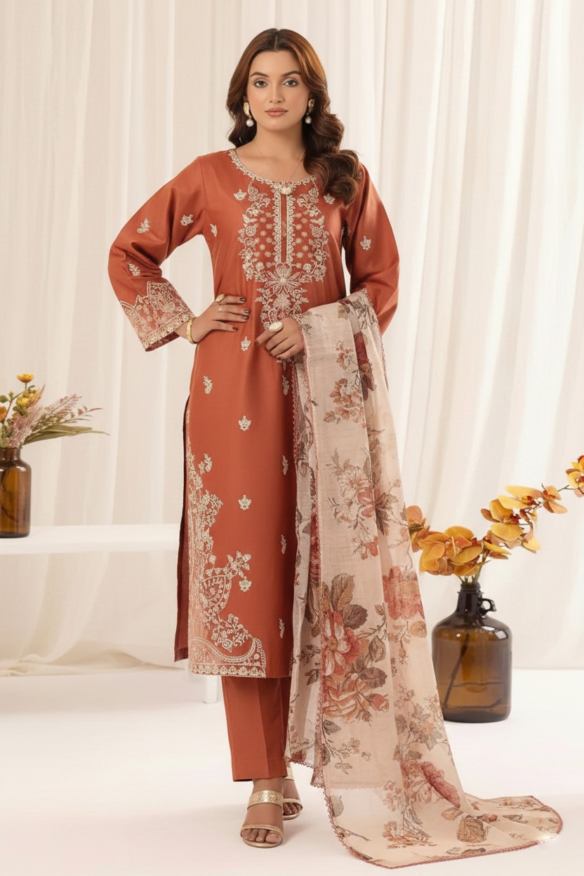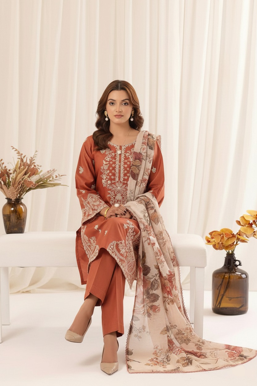 This premium 3-piece suit is designed with classy embroidery details and lightweight fabric to give you both comfort and style during the summer season.