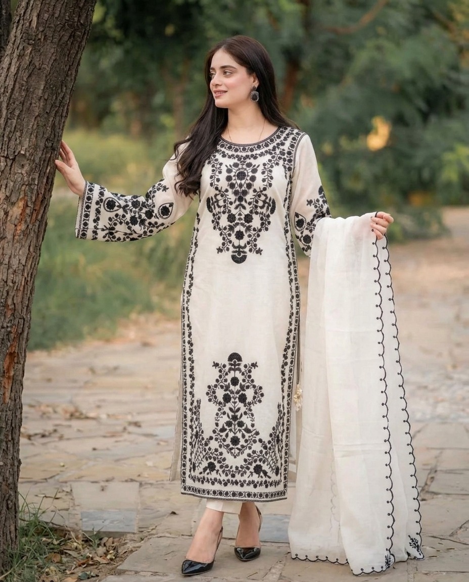 This stunning 3-piece suit includes shirt, trouser, and dupatta designed with refined embroidery and premium finishing for a classy and modern look.