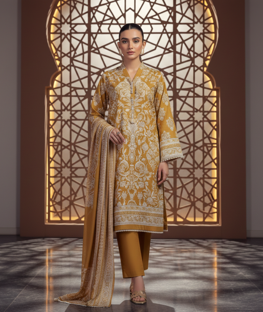 Y rememberably this 3-piece unstitched suit features a beautifully designed digital print lawn shirt, paired with a matching trouser and a lawn dupatta with 4-side printed borders, giving the outfit a premium and graceful finish.