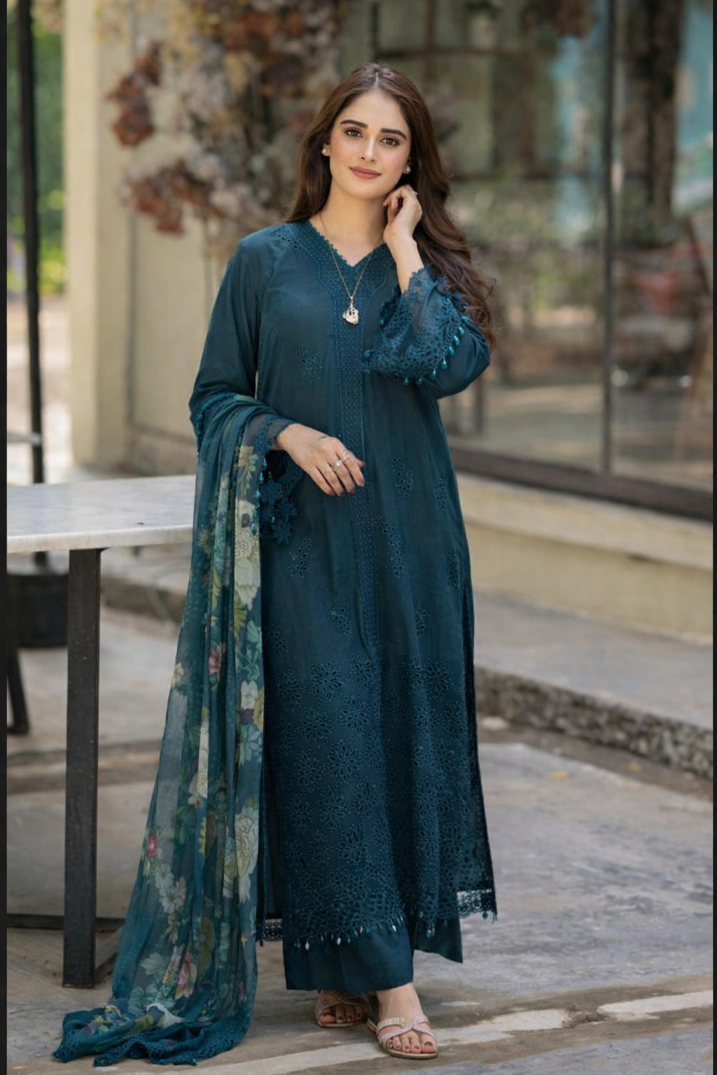 Made with *Fine Quality 90/70 Lawn Fabric*, this 3 Piece Suit set includes Shirt, Trouser & Printed Chiffon Dupatta for a complete graceful outfit.